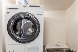 ✦ Laundry area in bathroom with Samsung washing machine and dryer.